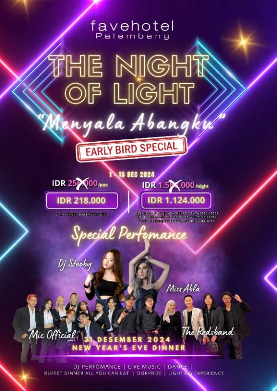 Menyambut momen liburan akhir tahun, favehotel Palembang menghadirkan paket early bird special “New Year’s” dengan tema The Nigt Of Light yang berlaku mulai 01 Desember 2024 hingga 31 Desember 2024.