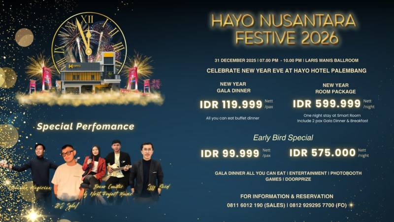Menyambut pergantian tahun, Hayo Hotel Palembang kembali menghadirkan perayaan istimewa bertajuk “Hayo Nusantara Festive 2026” yang akan digelar pada 31 Desember 2025, pukul 19.00–22.00 WIB di Laris Manis Ballroom. Acara ini dirancang sebagai momen kebersamaan penuh keceriaan untuk memanjakan para tamu yang ingin merayakan malam tahun baru dengan pengalaman berbeda dan penuh hiburan.