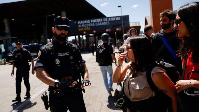 Polisi memberi tahu para turis bahwa stasiun kereta Atocha Madrid ditutup akibat mati listrik.ReutersPolisi memberi tahu para turis bahwa stasiun kereta Atocha Madrid ditutup akibat mati listrik.