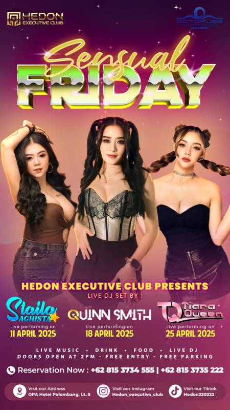 Program Hedon Executive Club Saat ini mengadakan parade Dj selama bulan april 2025 Bertema Sensual Friday, yang mana acara diadakan setiap hari Jum’at.