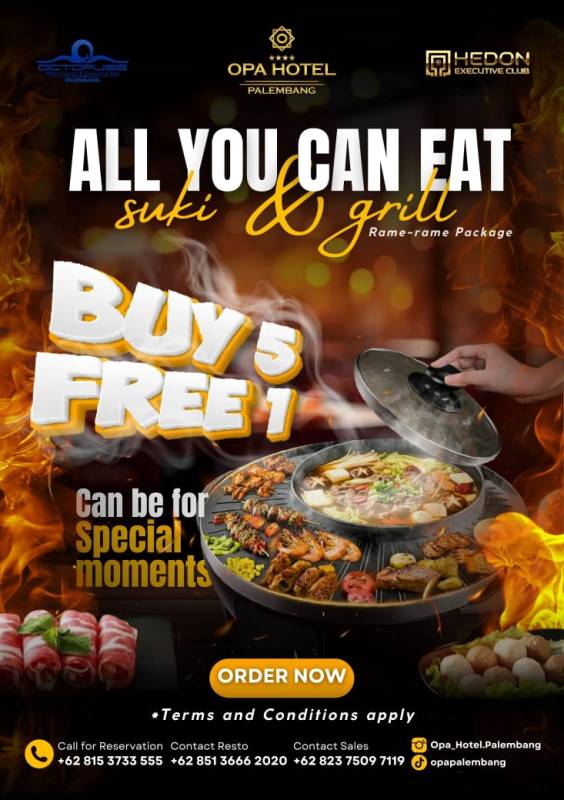 Dengan konsep yang modern dan suasana yang asyik, Opa Hotel menawarkan Suki & Grill berbagai menu yang lezat dan segar, Suki & Grill Kuah Mala, Kuah Collagen serta Kuah Tom Yam di padu pilihan daging seafood, Ayam,Ikan dan sayuran yang berkualitas. Anda dapat memilih dari berbagai paket menu yang sesuai dengan selera dan budget Anda.