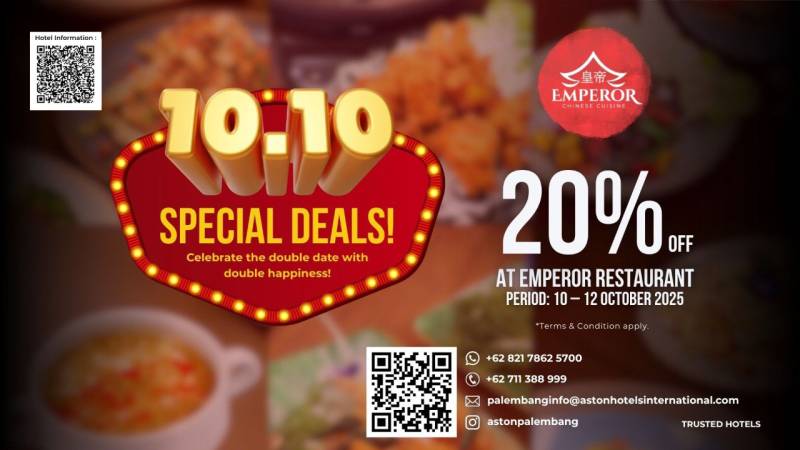 Dalam rangka menyemarakkan momen spesial 10.10, Emperor Restaurant di Aston Palembang Hotel & Conference Center menghadirkan promo menarik berupa diskon 20% untuk semua menu makan di tempat. Penawaran spesial ini berlaku selama periode 10–12 Oktober 2025, khusus bagi tamu yang melakukan reservasi terlebih dahulu.