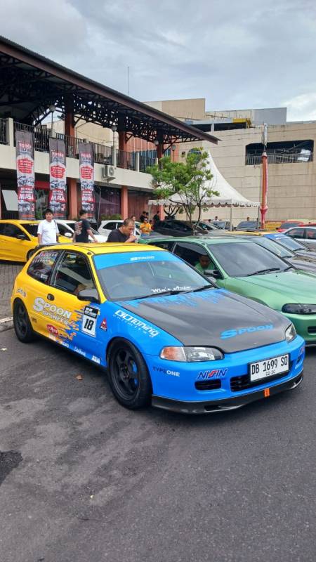 Honda Estilo Manado ini hadir dalam konsep full Spoon livery yang sangat ikonik. Hampir seluruh panel eksterior berbahan karbon: kap mesin, bagasi, spion, handle, spoiler, hingga lips dan fender bar. Kaki-kaki diperkuat full suspension Tein dan lengan Hardrace lengkap. Di sektor performa, transplant mesin K20A Type R lengkap dengan Hondata ECU membuatnya memiliki performa yang jauh di atas standar — salah satu modifikasi paling ekstrem di kompetisi regional tahun ini.