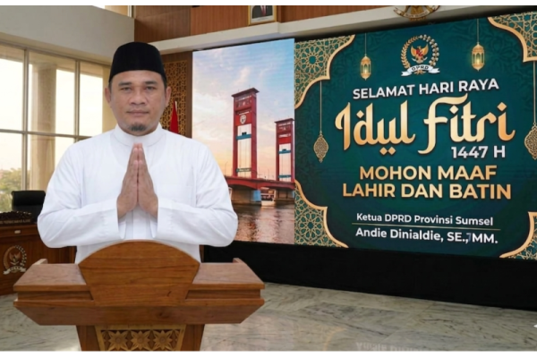 “Taqabbalallahu Minna Wa Minkum, Shiyamana Wa Shiyamakum. Saya, Andie Dinialdie, SE., MM., beserta keluarga dan seluruh jajaran DPRD Provinsi Sumatera Selatan, mengucapkan Selamat Hari Raya Idul Fitri 1447 H. Mohon Maaf Lahir dan Batin.”